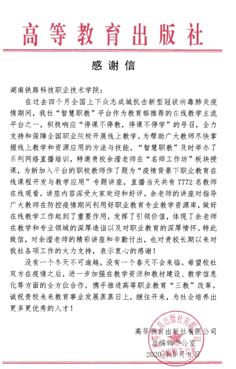 高教出版社给工作室余滢老师的感谢信
